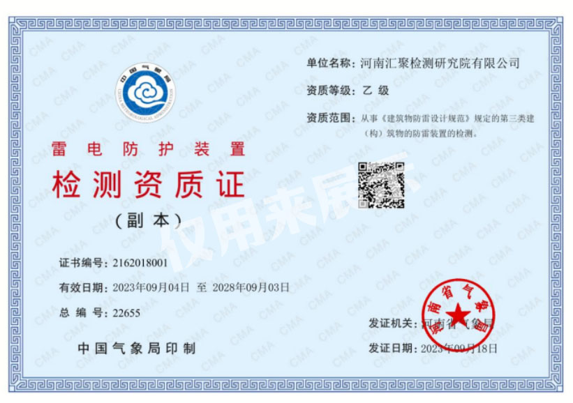 熱烈祝賀河南匯聚防雷檢測有限公司獲得CMA資質(zhì)